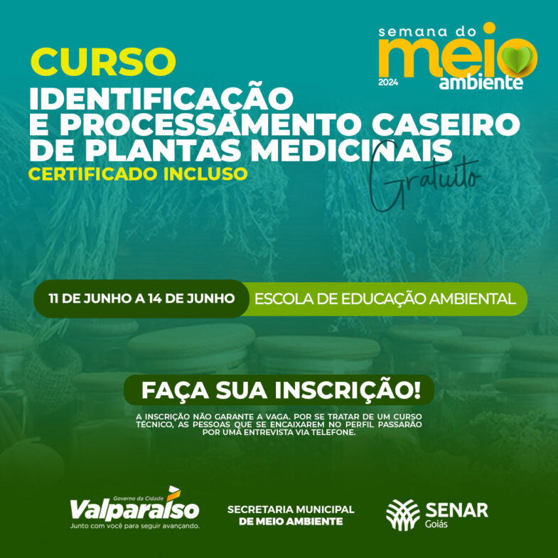 A capacitação é gratuita e inclui material didático e certificado. A Secretaria Municipal de Meio Ambiente, por meio da Escola de Educação Ambiental, realizará o curso sobre Identificação e Processamento Caseiro de Plantas Medicinais. A iniciativa conta com a parceria do SENAR – GO, com o objetivo de capacitar profissionais para elaborar formulações fitoterápicas, artesanalmente. Fazem parte do conteúdo programático: conceitos fundamentais no manuseio de plantas medicinais, formulações das plantas medicinais, conceitos e indicações, identificação das plantas medicinais, morfologia e odor, coleta de plantas medicinais e aproveitamento das propriedades terapêuticas, entre outros. O curso acontece nos dias 11 a 14 de junho e as vagas são limitadas. Os interessados deverão realizar a inscrição clicando aqui. A inscrição não garante a vaga. Por se tratar de um curso técnico, as pessoas que se encaixarem no perfil passarão por uma entrevista via telefone. Saiba mais sobre o curso através do site do SENAR-GO. SECOM-PMVG *com informações da Secretaria Municipal de Meio Ambiente