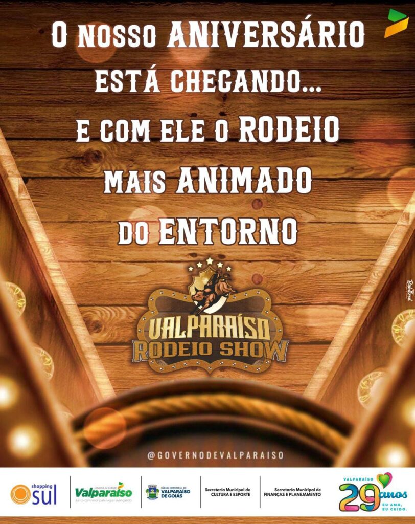 Após sucesso da última edição, Valparaíso Rodeio show promete ser ainda melhor este ano e faz parte da programação de 29 anos de Valparaíso de Goiás. No próximo dia 15, Valparaíso de Goiás celebrará 29 anos de emancipação político-administrativa. O Governo Municipal está organizando a 2ª edição do Valparaíso Rodeio Show, que acontecerá entre os dias 12 e 16. Após o sucesso do último evento, esta edição promete ser ainda melhor. Para quem não pôde comparecer na última vez, esta é a sua chance! Assim como no ano passado, o Rodeio Show terá entrada gratuita para toda a população e visitantes da cidade. A narração será do locutor Cuiabano, o mais conhecido na área por trazer uma excelentíssima narração e emoção para o rodeio. Uma praça de alimentação oferecerá uma grande variedade de comidas, um parque de diversões com brinquedos radicais para os mais corajosos e para as crianças. Os shows musicais terão a presença de grandes nomes do ramo sertanejo e rock, além de bandas locais para animar toda a população. Os eventos ocorrerão no bairro Parque Esplanada III, atrás do Shopping Sul, a partir das 19h. Vale lembrar que os rodeios acontecerão apenas de 12 a 15 de junho. Chegue cedo para aproveitar ao máximo tudo o que está sendo oferecido! Confira os detalhes na agenda e não deixe de participar: 12 de junho — Quarta-feira: Hugo & Guilherme, Roni e Ricardo, Luiz Henrique, Gil Araújo 13 de junho — Quinta-feira: Amado Batista, Erick Moral, Igor Rafael 14 de junho — Sexta-feira: Fernando & Sorocaba, Pedro Paulo & Matheus, Diego e Rangel, Victor Brener 15 de junho — Sábado: Gino & Geno, Gabriel Abreu, Lorran Original 16 de junho — Domingo: Banda Biquini, Léo Campos, Rock 62 Além dos shows, durante todo o mês de junho, o Governo Municipal organizou uma programação especial com muita festa, eventos culturais, esportivos e inaugurações, além do tradicional desfile cívico. 1/5