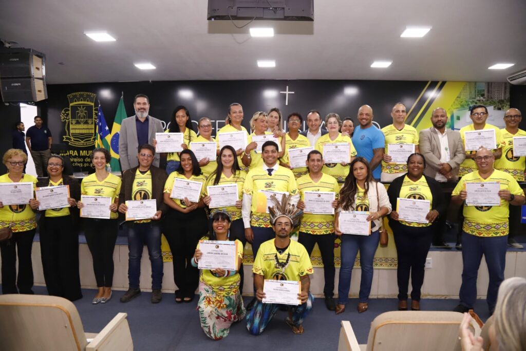 Tradicionalmente comemorado no mês de aniversário de emancipação política, o evento faz parte da programação de 29 anos de Valparaíso de Goiás. O Governo Municipal de Valparaíso de Goiás realizou na manhã desta quinta-feira (06), na Câmara de Vereadores, o Ato Público do Conselho Municipal de Promoção da Igualdade Racial (COMPIR). Tradicionalmente comemorado no mês de aniversário de emancipação política, o evento faz parte da programação de 29 anos de Valparaíso de Goiás. Representantes dos povos originários marcaram presença na Posse do Conselho Municipal de Promoção da Igualdade Racial (COMPIR). O COMPIR tem por finalidade a propositura de políticas públicas que promovam no município a igualdade racial da população negra, indígena e outras etnias, o combate à discriminação racial, a redução das desigualdades sociais, econômicas, financeiras, políticas e culturais, bem como, ampliar o processo de participação social. Na ocasião, Pábio Mossoró aproveitou a oportunidade para sancionar a Lei N⁰ 1.834, de 10 de maio de 2024, que inclui no Calendário Oficial de eventos do município de Valparaíso de Goiás, o evento anual do COMPIR. “O movimento contra o preconceito e a discriminação racial deve ser constante. Hoje nós participamos aqui na Câmara Municipal da posse do Conselho Municipal de Igualdade Racial. Sabemos que ainda existe um índice muito alto de discriminação, mas o nosso governo tem trabalhado nas escolas, a questão de combater o racismo, e nós seremos uma sociedade justa a partir do momento que todos tiverem a consciência de não podermos ter preconceito. E fico feliz porque a nossa gestão é uma gestão de todos”, afirmou o prefeito de Valparaíso, Pábio Mossoró. SECOM/PMVG
