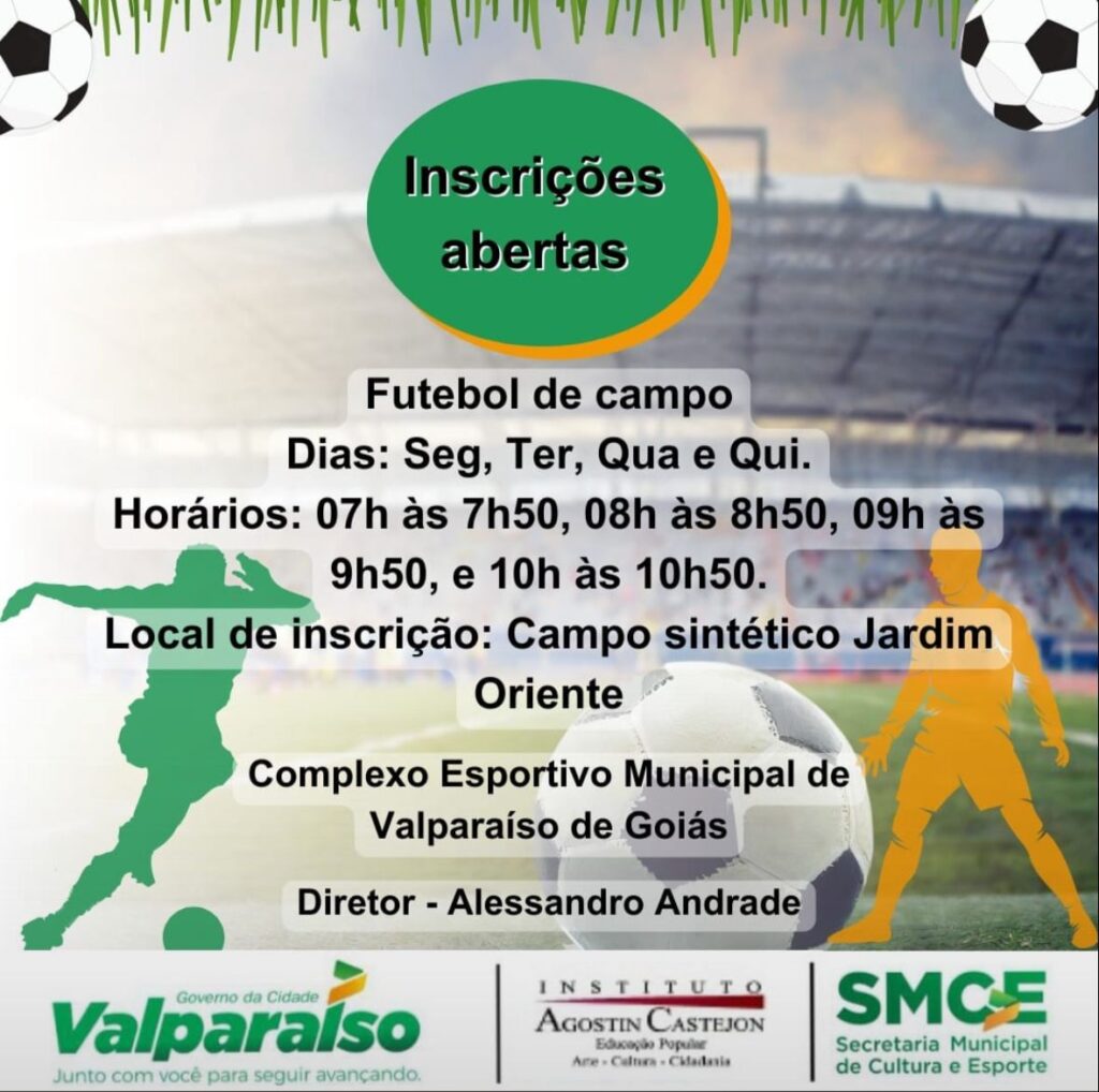 Serão atendidos os atletas de 10 a 15 anos de idade. O Governo de Valparaíso de Goiás, por meio da Secretaria Municipal de Cultura e Esporte (SMCE) está com inscrições abertas para as aulas gratuitas de futebol de campo, no recém inaugurado campo sintético do Jardim Oriente. Serão atendidos os atletas de 10 a 15 anos de idade. Os interessados podem ir pessoalmente ao Ginásio Poliesportivo do bairro, entre segunda e sexta-feira, das 8h às 18h, para realizar sua ficha de inscrição. As vagas são limitadas e o atleta deve optar por um dos seguintes horários matutinos: 7h às 7h50, das 8h às 8h50, das 9h às 9h50, ou das 10h às 10h50. As aulas acontecerão nas segundas, terças, quartas e quintas. Para efetuar a matrícula, o jovem deve levar sua identidade própria e do responsável, comprovante de residência, declaração escolar e uma foto 3×4. Para a efetivação da inscrição é necessário que o aluno esteja matriculado nas escolas do município. O início das atividades está marcado para o início de junho, quando as turmas fecharem. O objetivo do programa de incentivo às práticas esportivas é contribuir para a melhoria da qualidade de vida por meio do esporte comunitário, proporcionando um meio de socialização, educação, interação e desenvolvimento do talento de cada indivíduo. Para mais informações, entre em contato com a Secretaria de Cultura e Esporte, por meio do telefone: (61) 3627-1818. SECOM/PMVG