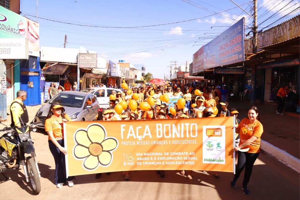 Ação percorreu as ruas do bairro Jardim Céu Azul e sensibilizou os participantes na manhã desta sexta-feira (17/05). O Dia Nacional de Combate ao Abuso e à Exploração Sexual de Crianças e Adolescentes é comemorado no dia 18 de maio. Pensando nisso, o Governo Municipal de Valparaíso de Goiás promoveu na manhã desta sexta-feira (17), a tradicional caminhada do Maio Laranja em alusão à campanha “Faça Bonito”, percorrendo as ruas do bairro Jardim Céu Azul. A ação “Faça Bonito” tem o objetivo de mobilizar e sensibilizar toda a sociedade a participar da luta em defesa aos direitos desse público alvo. O movimento, coordenado pela Secretaria Municipal de Assistência Social, Secretaria Municipal de Educação e Conselho Tutelar, reuniu diversas crianças, adolescentes, professores, autoridades locais e servidores de diversas pastas. “Então, crianças, saibam que a estrela do dia hoje são vocês. Tudo que a gente aqui, todos esses adultos fazem aqui hoje, estamos aqui no sol, estamos aqui trabalhando, é porque a gente se importa com cada um de vocês. Tá bom? Então, a gente sempre vai estar aqui lutando pela integridade física e psicológica de vocês“, discursou a secretária de Educação, Natássia Gadêlha. A mobilização “Faça Bonito” existe há 24 anos e para este ano de 2024, o foco é debater sobre os entraves e os desafios que envolvem a linha da Atenção/Atendimento Integral às crianças, adolescentes e suas famílias. O objetivo é abordar mais sobre as múltiplas necessidades para revisitar as políticas voltadas para o atendimento no país, além de destacar a data e convocar toda a sociedade a participar da defesa dos direitos de crianças e adolescentes. “O dia de hoje é um dia que a gente tem que relembrar a comunidade, a finalidade da proteção das crianças. Então, peço a vocês que a gente tenha sensibilidade de ouvir nossas crianças. Além dos pais, a escola tem uma importância muito grande, é na escola que elas têm o apoio e o convívio com os professores e orientadores“, disse a secretária de Assistência Social, Josélia Leão. O Disque-denúncia Nacional de Combate ao Abuso e à Violência Sexual contra Crianças e Adolescentes tem novo número: 100. O serviço é diário, inclusive feriados, das 8 às 22h. Disque 100 caso presencie algum tipo de abuso ou violência contra crianças e adolescentes. 1/7