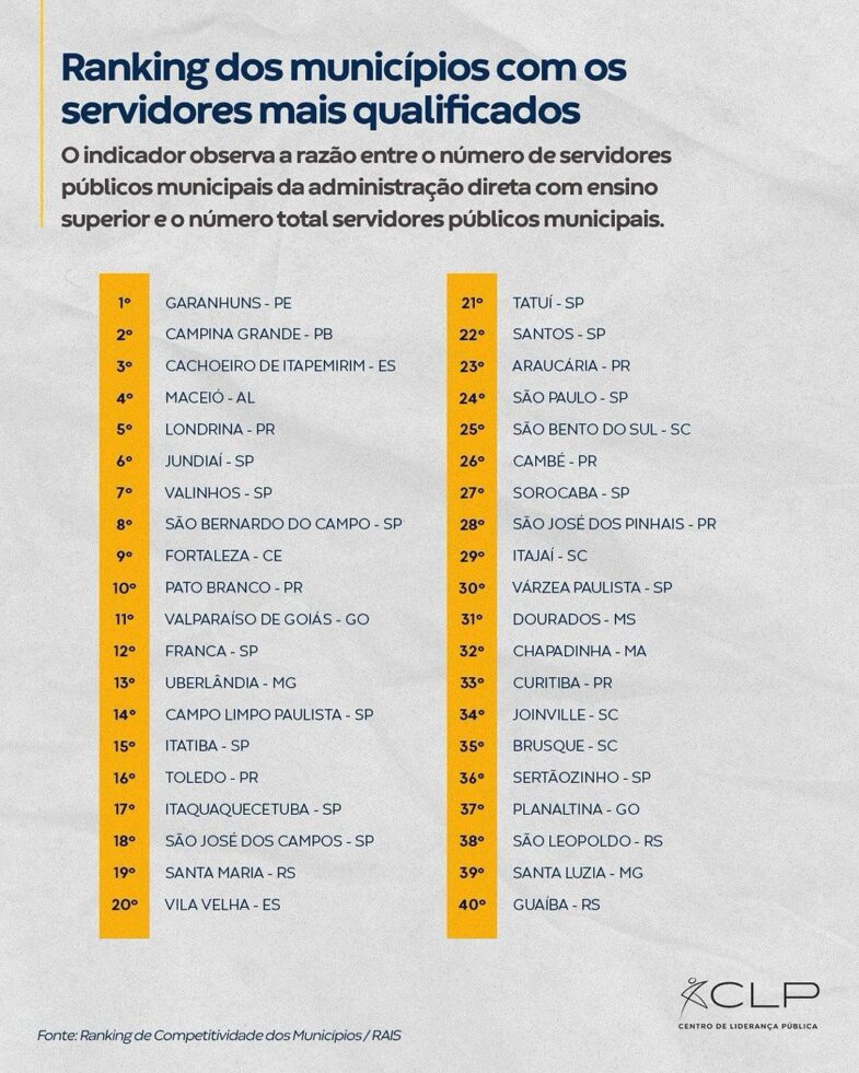 A informação foi divulgada pelo Centro de Liderança Pública (CLP) nesta terça-feira (24) A qualificação profissional dos servidores públicos do Governo Municipal de Valparaíso de Goiás, conquistou a 11ª colocação no ranking nacional de municípios, divulgado na manhã desta terça-feira (24), nas redes do Centro de Liderança Pública (CLP). A postagem ocorreu em decorrência ao dia do servidor público que será comemorado em todo o território brasileiro no dia 28 de outubro. Dos 40 municípios colocados como os melhores da lista, apenas Valparaíso de Goiás aparece entre os 15 colocados representando o estado de Goiás, ficando na frente de cidades como Franca (SP), Uberlândia (MG), Vila Velha (ES) e até mesmo da capital paulista, que no ranking ocupa o 24º lugar. Para conferir a postagem do CLP, basta acessar o link abaixo: SECOM/PMVG