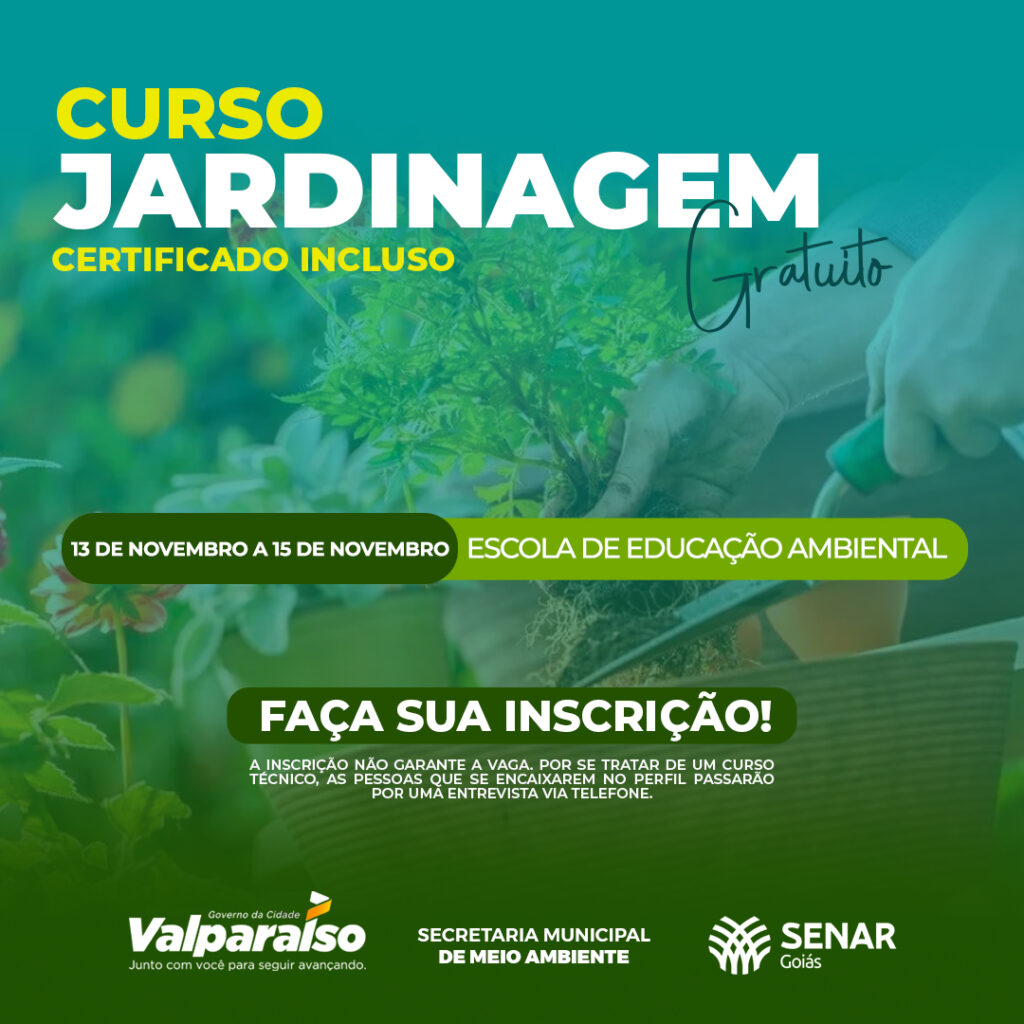 A capacitação é gratuita e inclui material didático e certificado. A Secretaria Municipal de Meio Ambiente, por meio da Escola de Educação Ambiental, realizará Curso de Jardinagem entres os dias 13 a 15 de junho. A iniciativa conta com a parceria do SENAR – GO, com o objetivo de capacitar profissionais para realizar a criação e manutenção de jardins. Os interessados deverão realizar a inscrição CLICANDO AQUI, contudo, a inscrição não garante a vaga. Por se tratar de um curso técnico, as pessoas que se encaixarem no perfil passarão por uma entrevista via telefone. Dentro do conteúdo programático, os alunos verão temas como: Importância do Paisagismo e Jardinagem para composição de áreas; Reconhecimento das condições físicas, estruturais e climática da área; Uso da tecnologia na produção de jardins; entre outros. Saiba mais sobre o curso através do site do SENAR-GO. SECOM-PMVG