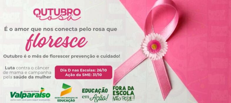 Educação Valparaisense adere a cor de rosa para salvar vidas. A Secretaria Municipal de Educação promove todos os anos uma campanha em rede sobre o Outubro Rosa, onde todas as escolas do município abraçam o tema e trabalham várias ações com a comunidade escolar, voltadas para a discussão e reflexão de atitudes que podem salvar a vida de muitas mulheres. Este ano, o slongan da Secretaria segue a linha do florescer, a partir do que tem sido trabalhado em outros projetos da Educação. “É o amor que nos conecta pelo rosa que floresce” traz a reflexão da importância de uma conexão de comunicação para que todos possam se inteirar mais sobre o assunto e saber agir adequadamente quando preciso, sem a sombra de consequências drásticas, pois quanto mais cedo se descobre o câncer de mama, maiores são as chances de cura, o que faz florescer essa conexão cor de rosa. As escolas da Rede Municipal estão convidadas para desenvolver ações importantes quanto a todo esse contexto no Dia D 26/10, que foi reservado para a celebração da prevenção e cuidados. No dia 31/10, a SME fará um momento de consolidação das atividades realizadas durante todo o mês de outubro. Participe! A Educação Valparaisense entra no clima cor de rosa para salvar vidas! SECOM-PMVG