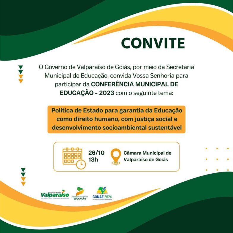 A Conferência Municipal de Educação é um importante momento de reflexão conjunta, objetivando propor ideias que ajudem a transformar a Educação. O Governo de Valparaíso de Goiás, por meio da Secretaria Municipal de Educação, convida a todos para participarem nesta quinta-feira, 26 de outubro, na Câmara Municipal de Valparaíso, às 13h, da Conferência Municipal de Educação-2023, com abordagem ao tema “Política de Estado para garantia da Educação como Direito Humano, com Justiça Social e Desenvolvimento Socioambiental Sustentável”. O evento é um importante momento de reflexão conjunta, objetivando propor ideias que ajudem a transformar a Educação. Serão promovidas discussões e tomada de decisões que serão levadas como sugestão para a Conferência Estadual de Educação que, por sua vez, chegarão à Conferência Nacional com o intuito de fazer importantes mudanças no Plano Nacional de Educação. Todos podem e devem participar, pois esse é um momento democrático e inclusivo. Por isso, é importante a presença de representantes da sociedade civil, órgãos governamentais e não governamentais, representantes dos diversos Conselhos, professores, estudantes, familiares e todos que tenham interesse em compreender e contribuir para o fortalecimento da Educação. “Estamos conectados com esse evento importante do contexto educacional e aguardamos você com as suas contribuições que ajudarão a desenvolver novos caminhos para a melhoria do ensino brasileiro”, afirmou a secretária de Educação, Rudilene Nobre.
