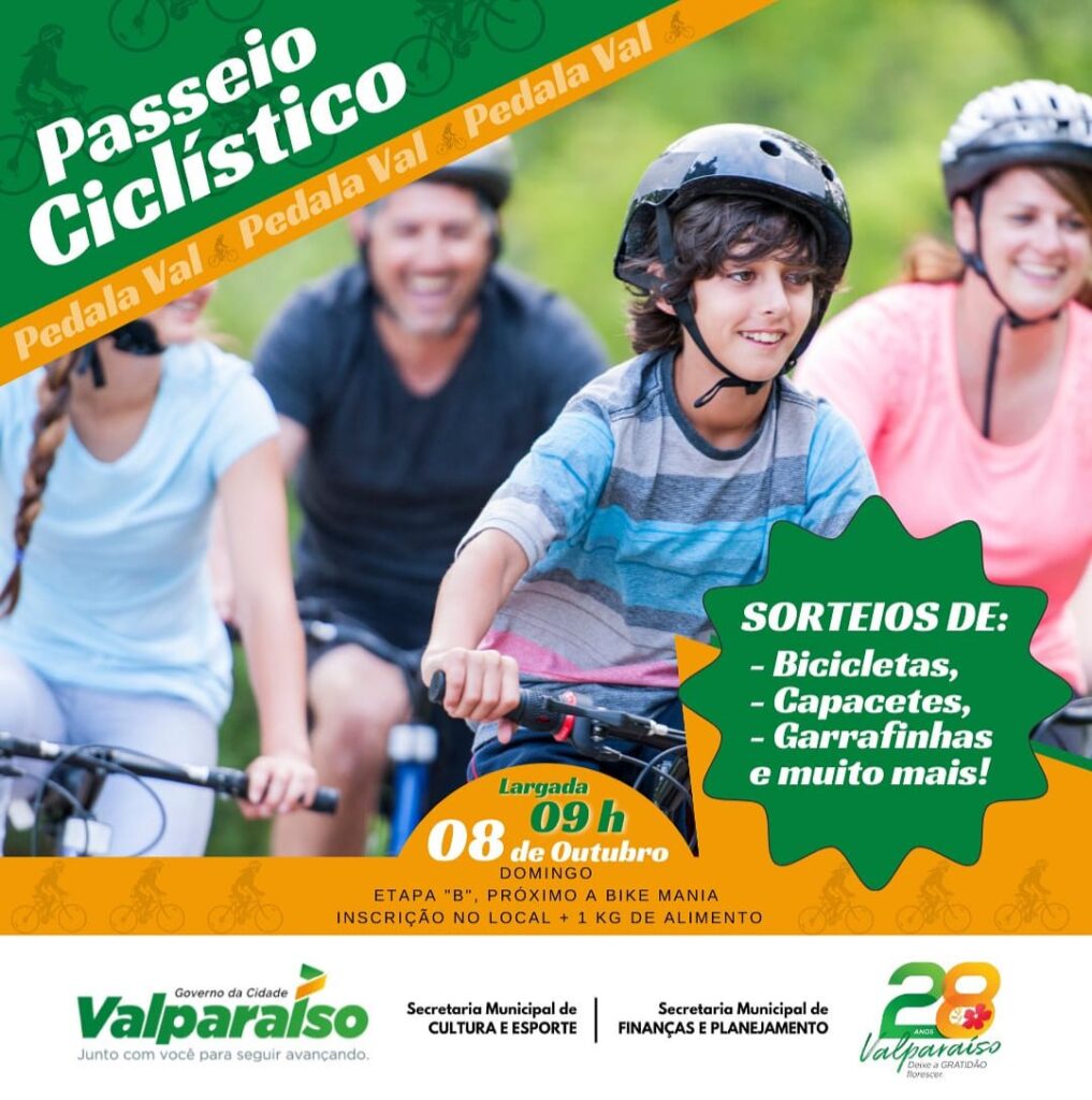 Evento esportivo reuniu crianças, adolescentes, adultos e idosos admiradores das bicicletas. No último domingo, 8 de outubro, o passeio ciclístico “Pedala Val 2023” movimentou as ruas do município de Valparaíso de Goiás. O Governo Municipal, por meio da Secretaria Municipal de Cultura e Esporte, em parceria com a Secretaria Municipal de Finanças e Planejamento, promoveu mais uma edição do famoso evento. A largada aconteceu às 9h, na Etapa B, ao redor da Bike Mania. O passeio contou com sorteios gratuitos de vários brindes de apoiadores e patrocinadores, além de muita animação. No ato da inscrição os participantes puderam contribuir com 1kg de alimento não perecível. A iniciativa reuniu crianças, adolescentes, adultos e idosos admiradores das bicicletas, com o objetivo de incentivar a prática de atividades esportivas ao ar livre na comunidade. “O Passeio Ciclístico foi um sucesso. Me sinto lisonjeado de ter participado deste evento que nos passou a mensagem sobre o quão importante é a valorização do esporte”, disse o prefeito Pábio Mossoró. O ciclismo é uma opção de transporte sustentável e além de deixar a cidade movimentada, promove a conscientização sobre a importância da preservação ambiental, cria laços entre amigos e família e contribui para a melhoria da saúde física e mental. “Nosso objetivo é sempre incluir no calendário essas ações voltadas ao esporte, como o ciclismo e a corrida, que possui muitos adeptos e que cresce diariamente em Valparaíso”, afirmou o secretário de Cultura e Esporte, Ricardo Viana. SECOM-PMVG 1/5