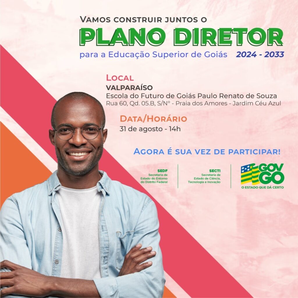 Evento ocorre a partir das 14h, na Escola do Futuro, Praia dos Amores. O Governo de Goiás está realizando discussão pública sobre o novo Plano Diretor para a Educação Superior (2024-2033). Desta vez, será a vez de Valparaíso de Goiás receber uma audiência sobre o tema, nesta quinta-feira (31-08), a partir das 14h, na Escola do Futuro, Rua 60, Quadra 5– B, s/nº, Praia dos Amores. A comunidade em geral está convidada a conhecer e expor ideias sobre o futuro da educação superior no Estado, especialmente, estudantes, professores e outros profissionais atuantes na educação na região do Entorno do Distrito Federal. O objetivo do ciclo de audiências públicas é apresentar os estudos já realizados nas primeiras etapas e criar uma agenda inclusiva e transformadora para os próximos dez anos, ouvindo a comunidade educacional. SECOM/PMVG