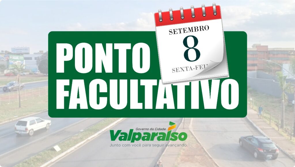 As atividades que exijam funcionamento essencial deverão estabelecer escalas de serviços, a fim de preservar o interesse público. O Governo de Valparaíso de Goiás, no uso das competências que lhe são conferidas no art. 69, da Lei Orgânica Municipal, decreta ponto facultativo no dia 8 de setembro de 2023 (sexta-feira), em decorrência do feriado nacional de 7 de setembro. O decreto é válido para o funcionamento dos Órgãos do Poder Executivo Municipal. As atividades que exijam funcionamento essencial deverão estabelecer escalas de serviços, a fim de preservar o interesse público. Serão mantidos os serviços de urgência e emergência dos hospitais, Samu, de limpeza urbana, de mobilidade urbana e da Defesa Civil, dentre outros. SECOM/PMVG