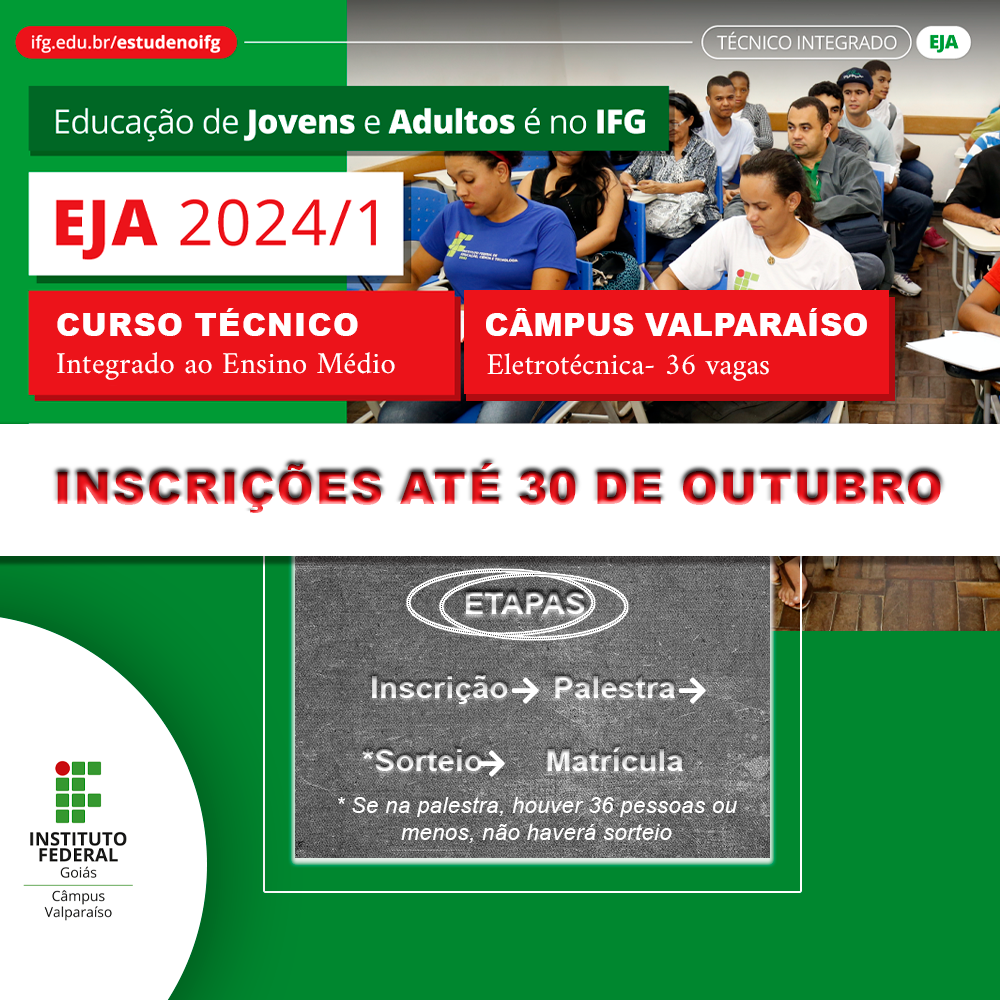 Educação de Jovens e Adultos é disponibilizada para estudantes que tenham 18 anos ou mais e não concluíram os estudos. O Câmpus Valparaíso do Instituto Federal de Goiás (IFG) está com as inscrições gratuitas abertas para 36 vagas para o curso técnico integrado em Eletrotécnica na modalidade de Educação de Jovens e Adultos (EJA). A EJA é disponibilizada para estudantes que tenham 18 anos ou mais e não concluíram os estudos. O técnico integrado, significa que você irá realizar o Ensino Médio e um curso profissional no mesmo período. No caso do nosso curso técnico integrado em Eletrotécnica-EJA, será presencialmente no período noturno, de segunda a sexta-feira, com duração de 4 anos. As inscrições são feitas até o dia 30 de outubro, por meio do site www.ifg.edu.br/estudenoifg, menu: “EJA- EDUCAÇÃO DE JOVENS E ADULTOS”. SECOM/PMVG