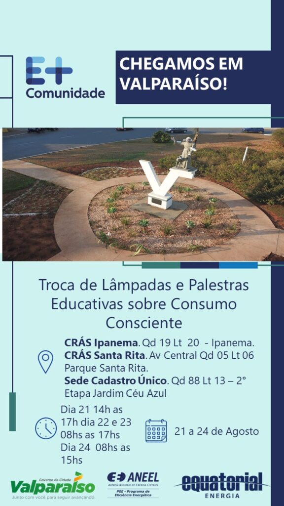 Serão feitos cadastros para sorteios de 80 geladeiras, troca de lâmpadas e para o curso de nail designer no CRAS Ipanema e no CRAS Santa Rita, além da sede do CadÚnico. A Caravana da companhia de energia Equatorial está passando pela cidade de Valparaíso de Goiás nesta semana, em uma parceria com a Secretaria Municipal de Assistência Social. Durante os dias 21 e 25 de agosto, serão feitos cadastros para sorteios e troca de 80 geladeiras, troca de lâmpadas e inscrição para o curso de nail designer no CRAS Ipanema, no CRAS Santa Rita e na sede do Cadastro Único, no Jardim Céu Azul. Para cadastrar e concorrer a uma das geladeiras, o consumidor precisa ser titular da conta de energia ou comprovar vínculo com o titular da conta, estar cadastrado no baixa renda ou apresentar a folha resumo do CadÚnico, a conta de energia dever ser residencial ou rural, não pode ter conta vencida na Equatorial, precisa estar presente no sorteio, a geladeira velha precisa estar funcionando (não troca freezer ou frigobar) e é responsabilidade do sorteado levar o aparelho e documentação solicitada até o local do evento para a retirada da nova. A troca de lâmpadas será feita para qualquer morador que apresentar a conta de energia e levar a antiga incandescente ou fluorescente. Sobre o curso de nails designer, é válido para qualquer pessoa que more no município apresentando a conta de energia e sendo maior de 14 anos. As aulas serão realizadas no dia 24 de agosto, das 08h às 12h, no Centro Comunitário: Área Especial, Quadra 192 – Nova Vila Guaíra. O atendimento da agência móvel estará disponível na Sede do CadÚnico, nos dias da Caravana, para os serviços que a loja física oferece, como por exemplo: cadastro na tarifa social, negociação de dívida, mudança de titularidade, 2º via, religação, etc. O sorteio das geladeiras para os clientes que cadastraram, troca de lâmpadas, palestras sobre consumo de energia e segurança, visitação a Nave Equatorial e atendimento da Agência Móvel ocorrerá no dia 24 de agosto, às 16h, na Escola Municipal Céu Azul: Rua 102, Qd. 115, Área Especial – Jardim Céu Azul. A troca das geladeiras dos clientes sorteados será realizada no dia 25/08 das 08h às 10h (por ordem de chegada) também na Escola Municipal Céu Azul. Locais da Caravana: Sede do Cadastro Único: Q.88, L.13 – 2ª Etapa Jardim Céu Azul CRAS Ipanema: Q.19, L.20 – Jardim Ipanema CRAS Santa Rita: Av. Central, Q.5, L.6, Parque Santa Rita SECOM/PMVG