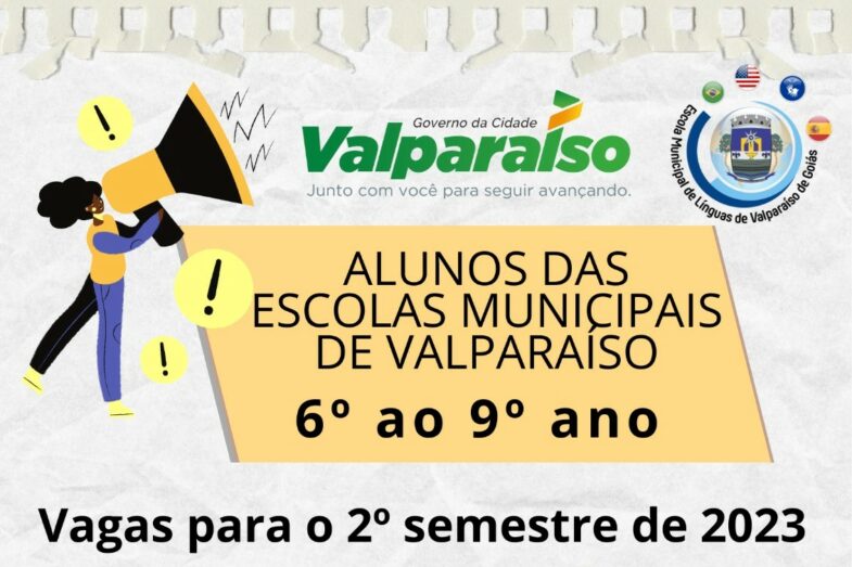 A matrícula é gratuita, nominal e intransferível! A Escola Municipal de Línguas de Valparaíso dá início nesta semana às inscrições para os cursos de Inglês, Espanhol e Libras referentes ao 2° semestre de 2023. As vagas disponibilizadas na próxima terça-feira, 11, são destinadas exclusivamente para adesões do público de estudantes da rede municipal, do 6° ao 9° ano. Os interessados devem comparecer a Escola de Línguas, entre 8h e 14h, portando os seguintes documentos e cópias: certidão de nascimento ou RG, CPF, declaração de escolaridade, comprovante de residência atual, 1 foto 3×4 e para alunos menores de 18 anos, RG e CPF do responsável. Nos dias 12 e 13 a Escola abre vagas para toda a comunidade. No total, serão 1.000 vagas disponibilizadas para Língua Estrangeira Moderna (Inglês e Espanhol) e para Língua Brasileira de Sinais (Libras), divididas entre os cursos disponibilizados. A Escola Municipal de Línguas fica localizada na Rua 13, Quadra 33, Lote 06, 1° andar, Parque Esplanada III (No prédio do Santander). Para mais informações, entrar em contato pelo número de telefone 61 3627-3161.