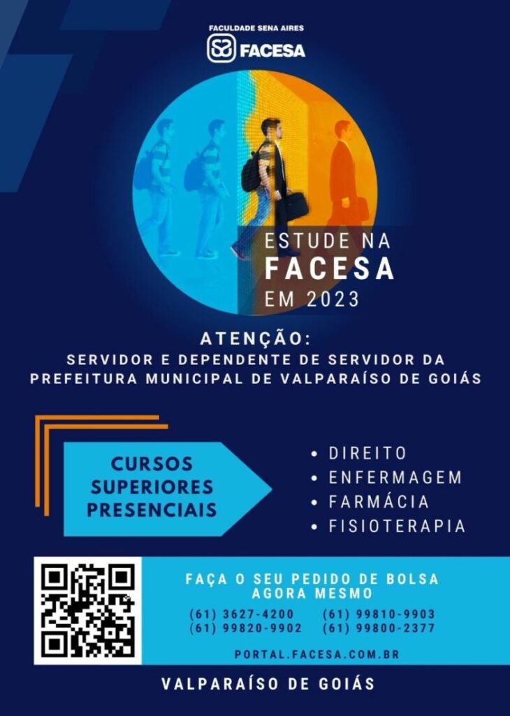 A instituição de ensino superior possui convênio com a prefeitura e oferece cursos superiores presenciais de direito, enfermagem, farmácia e fisioterapia. Servidores públicos e dependentes de servidores da prefeitura de Valparaíso, estude agora mesmo na Facesa – Faculdade de Ciência e Educação Sena Aires, em 2023 e aproveite descontos especiais para este público-alvo. A instituição de ensino superior possui convênio com a prefeitura e oferece cursos superiores presenciais de direito, enfermagem, farmácia e fisioterapia. Faça seu pedido agora mesmo, entre em contato através dos telefones (61) 3627-4200, (61) 99820-9902, (61) 99810-9903 ou (61) 99800-2377 ou acesse o link https://www.gestoreducacional.com.br/EVENTOS/Inscricao/Ficha_Inscricao.asp?codEmpresa=108&CodGrupo=9&TipoEvento=PS SECOM-PMVG