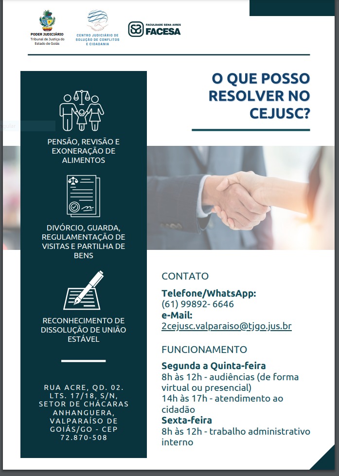 Espaço foi inaugurado na semana passada e fica instalado na Faculdade Sena Aires, Setor de Chácaras Anhanguera. A cidade de Valparaíso conta com uma sede própria do CEJUSC, Centro Judiciário de Solução de Conflitos e Cidadania, unidade do Poder Judiciário. O local fornece à população um serviço de conciliação e mediação de qualidade, por meio de profissionais capacitados. Lá podem ser resolvidos contratempos como pensão, divórcio, guarda, revisão e exoneração de alimentos, regulamentação de visitas e partilha de bens e reconhecimento de dissolução de união estável. O 2º CEJUSC de Valparaíso foi inaugurado na semana passada e fica instalado na Faculdade Sena Aires, Rua Acre, Qd 02, Lote 17/18, s/n, Setor Chácaras Anhanguera. O atendimento presencial é feito de segunda a quinta-feira. Para mais informações, entre em contato pelo WhatsApp (61) 99892-6646 ou pelo e-mail 2cejusc.valparaiso.tjgo.jus.br. SECOM-PMVG