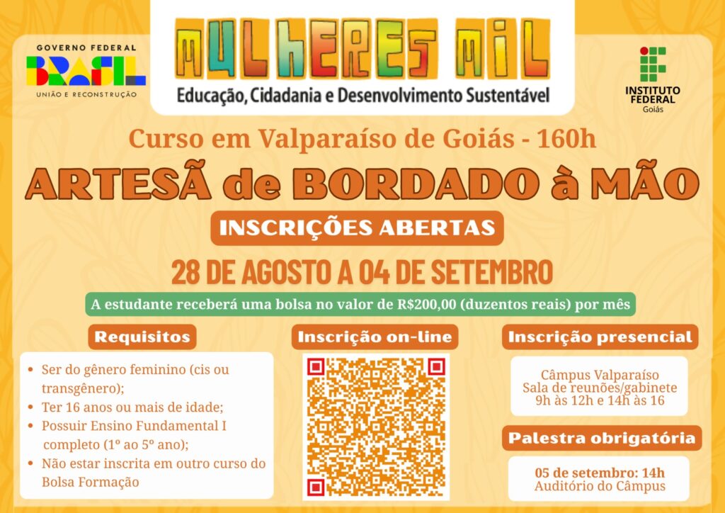 Publicado em 29/08/2025 O Instituto Federal de Goiás (IFG) – Câmpus Valparaíso está com inscrições abertas, de 28 de agosto a 4 de setembro, para o curso gratuito de Formação Inicial Continuada (FIC) em Artesã de Bordado à Mão. A iniciativa tem como objetivo oferecer capacitação profissional para mulheres em situação de vulnerabilidade residentes em Valparaíso de Goiás. As aulas serão presenciais, realizadas às segundas, quartas e sextas-feiras, das 13h às 17h, no Câmpus Valparaíso. Além da formação, cada estudante selecionada receberá uma bolsa auxílio de R$ 200,00 mensais para apoio durante o período do curso. Público-alvo e requisitos O curso é destinado exclusivamente a mulheres (cis ou transgênero) que atendam aos seguintes requisitos: – Ter 16 anos ou mais; – Possuir Ensino Fundamental I completo (1º ao 5º ano); – Ter cadastro ativo no CadÚnico; – Não estar inscrita em outro curso do Bolsa Formação; – Não ter participado da mesma formação em edições anteriores. A seleção será realizada em três fases: – Inscrição – de 28 de agosto a 4 de setembro; – Palestra e sorteio – no dia 5 de setembro, às 14h, no Câmpus Valparaíso; – Matrícula – entrega de documentação exigida no mesmo dia do sorteio. Todas as etapas são obrigatórias para garantir a vaga. Como se inscrever As inscrições podem ser feitas pelo link: https://forms.gle/hVCPCHjQQQE5NCbb6, utilizando uma conta de e-mail Gmail. Quem preferir poderá se inscrever pessoalmente no Gabinete/Sala de Reunião do Câmpus Valparaíso, no horário das 9h às 12h e das 14h às 16h, até o dia 4 de setembro (exceto finais de semana, quando não há atendimento). Mais informações e detalhes sobre o processo de seleção estão disponíveis no edital publicado pelo IFG. SECOM-PMVG Coordenação de Comunicação Social/Campus Valparaíso