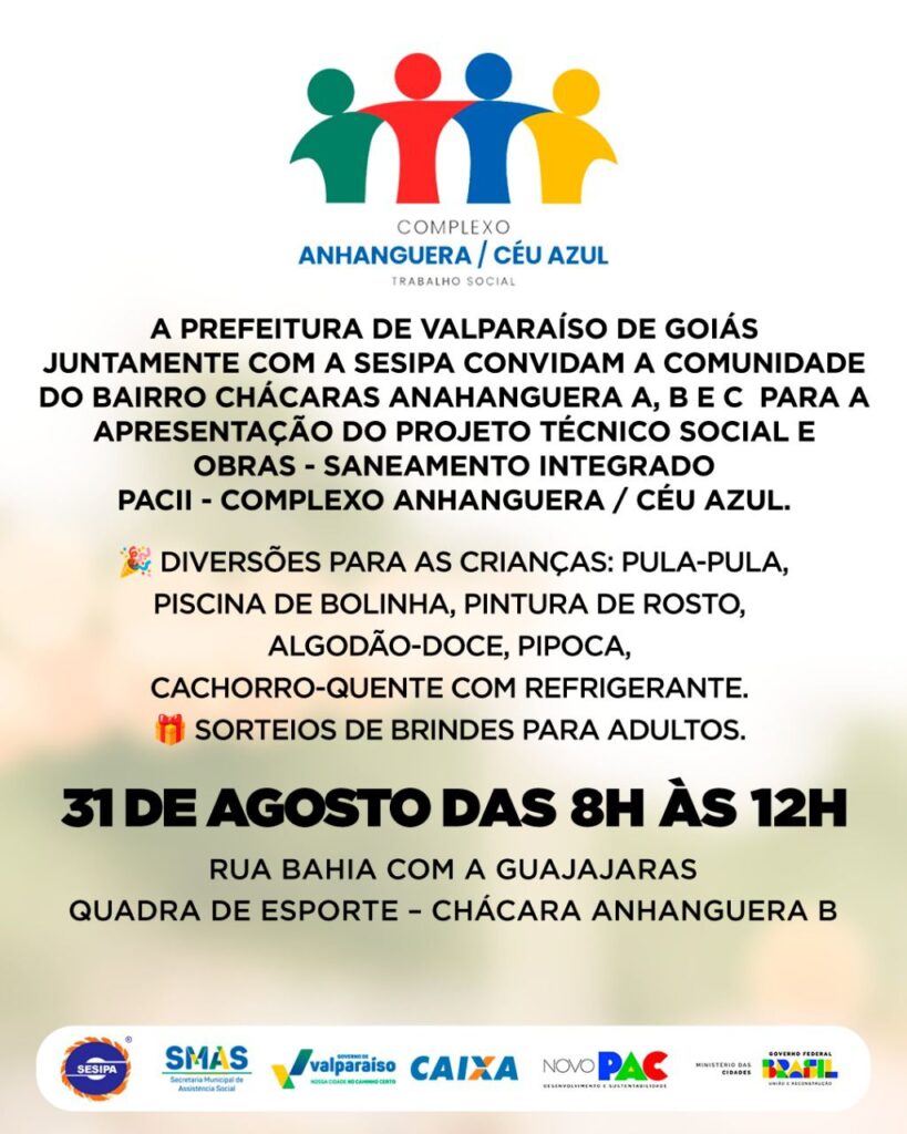 Atualizado em 30/08/2025 A Prefeitura de Valparaíso de Goiás convida toda a comunidade para participar dos eventos de apresentação do Projeto Técnico Social e Obras de Saneamento Integrado ao PAC II – Complexo Anhanguera/Céu Azul. A iniciativa tem como objetivo aproximar os moradores das ações em andamento, esclarecer dúvidas, apresentar os benefícios das obras e reforçar o compromisso do município com a melhoria da qualidade de vida da população. As apresentações acontecerão no sábado, dia 30 de agosto, das 8h às 12h, em frente à Escola Municipal Professora Maria do Nascimento Paiva; e no domingo, dia 31 de agosto, no mesmo horário, na Quadra de Esportes localizada na Rua Bahia com a Guajajaras, no bairro Chácaras Anhanguera B. Além das apresentações, os encontros contarão com uma programação especial para toda a família, haverá atividades recreativas para as crianças, sorteios de brindes para os adultos e muito mais. A Prefeitura reforça o convite a todos os moradores para participarem desse momento de integração e cidadania. Contamos com a presença de todos.