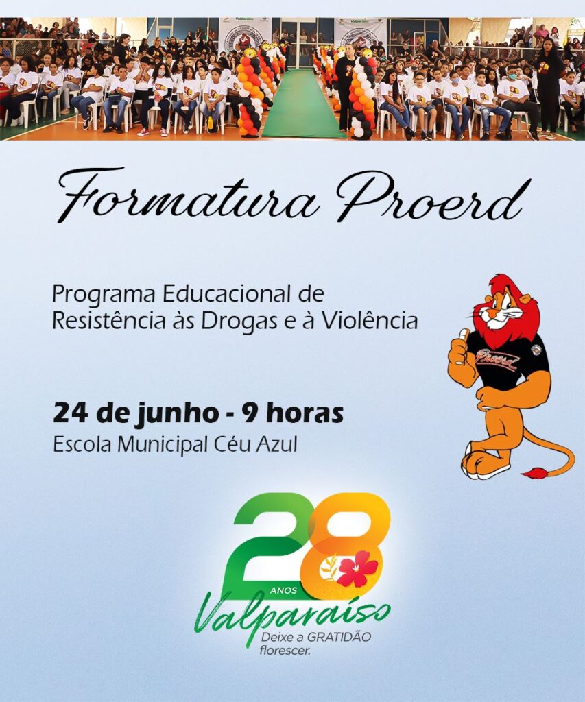 O PROERD é uma atividade educacional e preventiva. O Governo Municipal, por meio da Secretaria de Educação, em parceria com Polícia Militar do Estado de Goiás realizará, no dia 24 de junho, às 9h, a formatura dos alunos do PROERD, programa de resistência às drogas e à violência. O PROERD é uma atividade educacional e preventiva, é mais um fator de proteção desenvolvido pela Polícia Militar para a valorização da vida, que busca evoluir uma sociedade mais saudável, feliz e mais segura, e além de marcar o encerramento das aulas, serve como incentivo e reforço das lições transmitidas durante o projeto, cujo objetivo é realizar a prevenção contra as drogas nas escolas. A cerimônia acontecerá na Escola Municipal Céu Azul, onde os alunos receberão o certificado de conclusão do programa. A iniciativa tem como base metodológica, o objetivo de reforçar a autonomia e impedir que más escolhas sejam feitas por impulso ou influências, lhes mostrando os efeitos das drogas e ensinando as habilidades necessárias e motivação para se manterem longe desse mal. SECOM/PMVG
