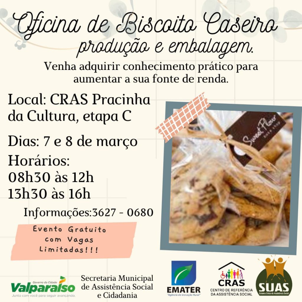 Ação é a oportunidade ideal para a obter uma nova fonte de renda. A especialização em novas áreas profissionais proporciona o aumento da renda mensal que pode ajudar famílias e pequenos empreendedores. Pensando nisso, durante os dias 7 e 8 de março, a comunidade valparaisense poderá participar da Oficina de Biscoito Caseiro, promovida pela Secretaria Municipal de Assistência Social e Cidadania, por meio do Centro de Referência da Assistência Social (CRAS). A ação acontecerá na Pracinha da Cultura, Etapa C do Valparaizo I, de 8h30 às 12h e de 13h30 às 16h. O projeto é voltado aos usuários do CRAS, visando proporcionar aprendizado sobre produção culinária de biscoitos e confecção de embalagens aos entusiastas da gastronomia. Com o conhecimento adquirido, os participantes abrirão novas portas para faturar uma renda extra e receberão certificados emitidos pela EMATER-GO. Assessoria de Comunicação do Governo da cidade de Valparaíso de Goiás