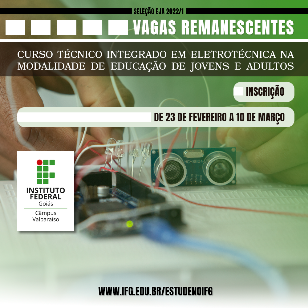 Podem se inscrever pessoas com 18 anos ou mais, que possuem Ensino Fundamental completo A educação que faz do futuro um lugar de esperança e transformação. Por isso, aproveitem as oportunidades ofertadas pelo Instituto Federal de Goiás, em seu câmpus de Valparaíso de Goiás. Se você tem 18 anos ou mais, possui o Ensino Fundamental completo, se inscreva para fazer gratuitamente o curso técnico integrado em Eletrotécnica na modalidade de Educação de Jovens e Adultos- EJA. No técnico integrado, o estudante realiza o Ensino Médio e a educação profissional no mesmo período. O curso técnico integrado em Eletrotécnica- EJA ocorre no período noturno, de segunda-feira a sexta-feira. Saiba mais: Seleção EJA 2022/1. Vagas remanescentes. Inscrições do dia 23 de fevereiro a 10 de março. Total de vagas disponíveis: 27. Perguntas 1 – E onde fazer a inscrição? Apenas pelo site. Vamos ao endereço da página da seleção? www.ifg.edu.br/estudenoifg , seção: “EJA- Educação de Jovens e Adultos”. Link: “Seleção Vagas Remanescentes EJA 2022/1- Câmpus Valparaíso”. Depois vai no link: “Inscrição ON-LINE”. Mas atenção! Depois da inscrição ainda é necessário realizar a postagem da documentação via upload, veja a pergunta abaixo. 2 – E o que precisa para fazer a inscrição? Realizar o upload da documentação exigida na Chamada Pública Remota em arquivo único e formato .pdf. O upload deve ser feito no link: “Postagem da documentação obrigatória para participação da seleção” disponível na página da seleção. O candidato também deverá preencher o formulário de inscrição na página da seleção no link: “Inscrição ON-LINE”. 3 – E como será a seleção? Caso tenha mais inscritos que o número de vagas, o processo seletivo se dará por média das notas finais contidas no histórico escolar do aluno durante os três últimos anos do Ensino Fundamental. 4 – Para fazer o curso técnico integrado, sou obrigado a realizar o Ensino Médio? Sim, o Ensino Médio é realizado junto ao técnico. 5 – Se eu tenho o Ensino Médio incompleto posso participar? Sim, mas deverá realizar todos os anos do Ensino Médio com a gente caso venha a ser classificado. 6 – Requisitos para realizar o curso? Ter o Ensino Fundamental completo e 18 anos ou mais no dia da matrícula. Importante Atenção ao formulário de matrícula! No dia 17 de março será divulgado o resultado final e caso você esteja classificado no número de vagas, você deverá preencher o formulário de matrícula que ficará disponível após o resultado na página da seleção. Assessoria de Comunicação do Governo da cidade de Valparaíso de Goiás/*Com as informações da Comunicação-IFG