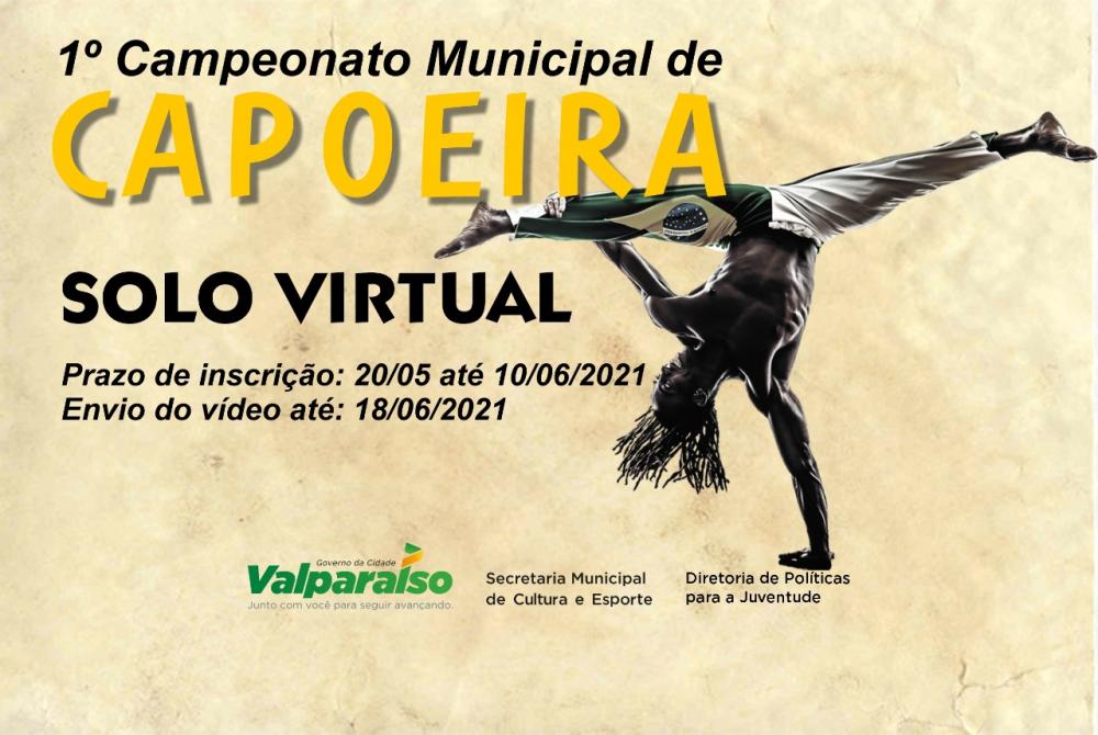 O município de Valparaíso de Goiás receberá o 1º Campeonato Municipal De Capoeira Solo Virtual, promovido pelo Governo da cidade, por meio da Secretária Municipal de Cultura e Esporte e da Divisão de Juventude e Artes Marciais. O evento será destinado aos moradores do município, Distrito Federal e Entorno. As regras da competição são adaptadas de acordo com os critérios técnicos dos árbitros escolhidos para julgarem e terá a supervisão da Divisão de Juventude e Artes Marciais, que é comanda pelo diretor Sergio Ramos. A iniciativa tem como objetivo fomentar o esporte e criar interação entre os seus praticantes e demais envolvidos, seguindo orientações sanitárias e respeitando os cuidados diante do cenário atual enfrentado na pandemia da Covid-19. A inscrição deverá ser realizada pelo professor do atleta ou o próprio atleta pelo link disponibilizado. As duvidas podem ser sanadas pelo número de WhatsApp (61)98479.0762 ou no e-mail: artesmarciaisval@gmail.com. O prazo para se inscrever vai do dia 20/05/2021 até o dia 10/06/2021 e o envio do vídeo até o dia 18/06/2021. Acesse o formulário de inscrição. Quem pode participar? Clique aqui e confira todas as categorias e o regulamento do campeonato. Faça sua inscrição Conheça o Canal do Youtube das Artes Marciais de Valparaíso. Assessoria de Comunicação do Governo da cidade de Valparaíso/ Arte: Rangel Franco