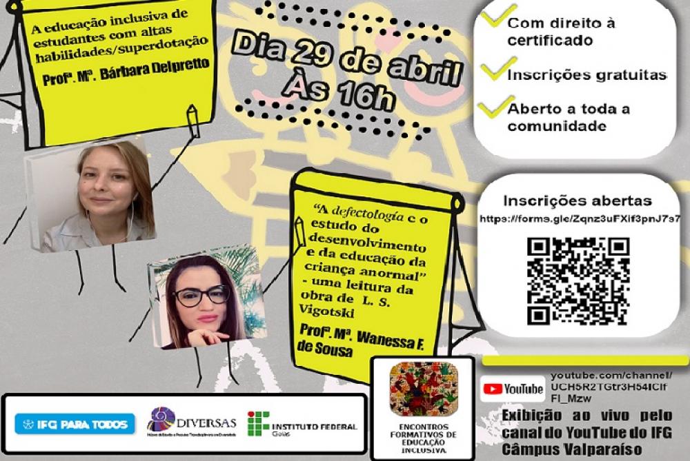 O próximo Encontros Formativos irá acontecer no dia 29 de abril, às 16h, e está aberto a toda a comunidade. Com direito à certificado, inscreva-se: https://forms.gle/Zqnz3uFXif3pnJ7s7. A exibição será pelo nosso canal do YouTube. Serão duas palestras, em um dos temas serão abordadas as altas habilidades e no outro o campo da “defectología” (obra de L. S. Vigotski). Atenção, se tiver interesse em receber o certificado, não deixe de se inscrever com antecedência e claro, anote na agenda o dia da transmissão no YouTube! Esta ação faz parte do projeto Encontros Formativos de Educação Inclusiva do IFG Câmpus Valparaíso. Em 2021, esta ação fornecerá 12 encontros com especialistas em diversas áreas com foco na educação inclusiva. Faz parte desta iniciativa o Núcleo de Pesquisa Diversas do IFG Câmpus Valparaíso e parcerias com os Núcleos de Atendimento às Pessoas com Necessidades Específicas (NAPNEs) dos Câmpus Valparaíso, Águas Lindas, Luziânia e Formosa. Temas das palestras do dia 29 de abril, às 16h “A educação inclusiva de estudantes com altas habilidades/superdotação” Profª. Mª. Bárbara Delpretto “A defectología e o estudo do desenvolvimento e da educação da criança anormal” – uma leitura da obra de Lev Semionovitch Vigotski Profª. Mª. Wanessa F. de Sousa Acesse a página oficial do “Encontros Formativos”. Postado pela Assessoria de Comunicação do Governo da cidade de Valparaíso/ Com as informações da Coordenação de Comunicação Social/Câmpus Valparaíso