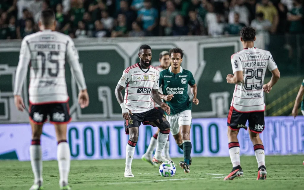 Partida é absolutamente fria no Estádio da Serrinha e termina sem destaque Goiás e Flamengo se enfrentaram nesta quarta-feira (20), no Estádio da Serrinha, em jogo válido pela 24ª rodada do Campeonato Brasileiro. Em partida absolutamente fria, o primeiro tempo foi sonolento e teve apenas três finalizações – duas do Esmeraldino e uma do Rubro-Negro. Na segunda etapa, CINCO PONTOS QUE MARCARAM A PARTIDA: > AQUI NESTA PARTE, NORMALMENTE, NÓS DESTACAMOS OS CINCO MELHORES LANCES. MAS, O JOGO FOI TÃO RUIM, QUE FICAREI DEVENDO COISAS BOAS!> O primeiro tempo teve apenas TRÊS finalizações. Foi o jogo de menos arremate no Brasileirão, junto de Cruzeiro e Botafogo (tá vendo como foi ruim?)> SAMPAOLI CHUTA O MICROFONE! O problema do Flamengo estava longe de ser o microfone da transmissão, mas o técnico achou uma boa ideia protagonizar essa imagem 🙂>ROSSI FAZ PRIMEIRAS DEFESAS PELO FLAMENGO! Estreante da noite, o goleiro argentino fez suas primeiras intervenções com a camisa rubro-negra. Arqueiro entrou em campo após dois meses de clube> SALVA, BRUNO MELLO! Aos 45 do segundo tempo, o Flamengo conseguiu fazer uma pressão ao Goiás. Thiago Maia lançou para Cebolinha, que cruzou na área. A bola bateu no jogador esmeraldino e foi para lateral COMO FOI O PRIMEIRO TEMPO? Pífio. Os primeiros 45 minutos de jogo no Estádio da Serrinha não tiveram absolutamente nada que mereça destaque. A etapa inicial terminou sem finalizações ao gol, com o Flamengo alcançando 80% de posse de bola, mas apenas com toques para os lados. O Goiás se limitou a permanecer no campo defensivo. E A ETAPA FINAL? Sonolento como a primeira etapa, o segundo tempo não teve destaques. Rossi, estreante da noite, fez poucas intervenções. O Goiás apenas se defendeu e não demonstrou criatividade, enquanto o Flamengo conseguiu uma sutil ‘pressão’ nos minutos finais, com a entrada de Cebolinha, mas nada que se aproveite de um jogo que antecede uma final de Copa do Brasil. O QUE VEM POR AÍ? O Flamengo volta a campo no domingo, dia 24 de setembro, para enfrentar o São Paulo no segundo jogo da final da Copa do Brasil. A bola rola no Morumbi, às 16h (horário de Brasília). Já o Goiás fará sua próxima partida apenas no dia 2 de outubro, contra o Botafogo, às 20h, em partida válida pelo Brasileirão. GOIÁS X FLAMENGO Data e hora: 20 de setembro de 2023, às 19h (de Brasília)Estádio: Hailé Pinheiro (GO)Árbitro: Rafael Claus (SP / Fifa)Assistentes: Neuza Inês Back (SP / Fifa) e Marcelo Carvalho Van Gasse (SP)VAR: Rodrigo D’Alonso Ferreira (SC)Onde assistir: Premiere (tv fechada). O Lance! acompanha o duelo em tempo real Gols: Cartão amarelo: Fabricio Bruno, Bruno Henrique e Igor Jesus (FLA) e Julián Palacios (GOI)Cartão vermelho: GOIÁS (Técnico: Armando Evangelista) Tadeu, Maguinho, Lucas Halter, Bruno Melo, Hugo, Morelli, Luis Oyama, Guilherme (Dodô/20′ do 2ºt), Anderson (Julián Palacios/intervalo), Matheus Babi (Denzel/20′ do 2ºt) e Allano (Vinicius) FLAMENGO (Técnico: Jorge Sampaoli) Rossi, Matheuzinho, Fabrício Bruno, Pablo e Ayrton Lucas; Thiago Maia, Gerson (Cebolinha/37′ do ºt), Victor Hugo (Igor Jesus/26′ do 2ºt), Everton Ribeiro (Pedrinho/26′ do 2ºt), Bruno Henrique e Pedro