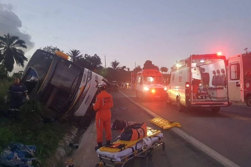 Excursão saiu do Rio de Janeiro com destino a Porto Seguro (BA) Um acidente com ônibus de turismo deixou oito mortos e 23 feridos na BR-101, na altura da cidade de Teixeira de Freitas, no extremo sul da Bahia, na madrugada desta quinta-feira (11), de acordo com informações do Corpo de Bombeiros. Por volta das 4h20, o veículo bateu em um barranco e tombou na rodovia na altura do Km 885 da rodovia, segundo a Polícia Rodoviária Federal. O ônibus levava 34 pessoas. Os dois motoristas saíram ilesos do acidente, de acordo com a corporação. Os feridos foram levados para unidades de saúde da região. Além dos bombeiros e da PRF, a Polícia Civil, a Polícia Militar e o Samu (Serviço de Atendimento Móvel de Urgência) estão no local da ocorrência. O ônibus é da empresa RM Turismo e saiu do Rio de Janeiro com destino a Porto Seguro (BA), que lamentou o acidente. “Neste momento delicado, estamos empenhados em prestar todo o suporte necessário aos envolvidos. A RM Turismo se coloca à disposição para fornecer qualquer informação para auxiliar no que for preciso para amenizar os impactos desse acontecimento”, afirmou a empresa, por meio de nota. O ônibus de excursão saiu do bairro da Penha, no Rio de Janeiro, na tarde de quarta-feira (10) e chegaria a Porto Seguro na manhã desta quinta. A previsão era de que os turistas deixariam a cidade baiana na segunda-feira (15) e retornariam a capital carioca na terça-feira (16).