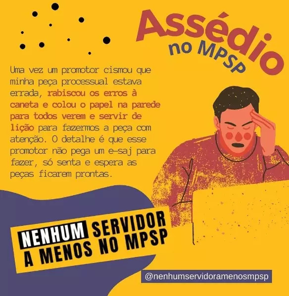 Apesar da fala de Sarrubo, o Ministério Público de São Paulo enfrenta outro problema além dos três casos de suicídio. Há grupo on-line que acusa o órgão de ser um ambiente propício à prática de assédio moral. No Instagram, o perfil Movimento Nenhum Servidor a Menos no MPSP conta com 2,2 mil seguidores. A página, que lembra dos colegas que se mataram, divulga relatos anônimos de assédio moral.