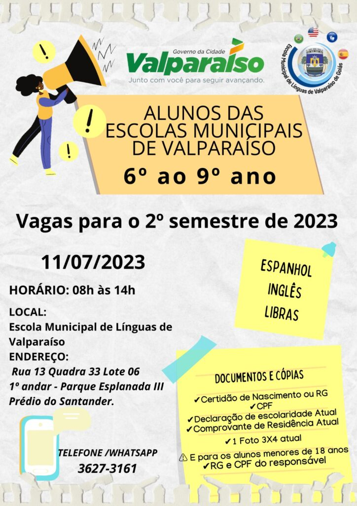 A Escola Municipal de Línguas de Valparaíso dá início nesta semana às inscrições para os cursos de Inglês, Espanhol e Libras referentes ao 2° semestre de 2023. As vagas disponibilizadas na próxima terça-feira, 11, são destinadas exclusivamente para adesões do público de estudantes da rede municipal, do 6° ao 9° ano.