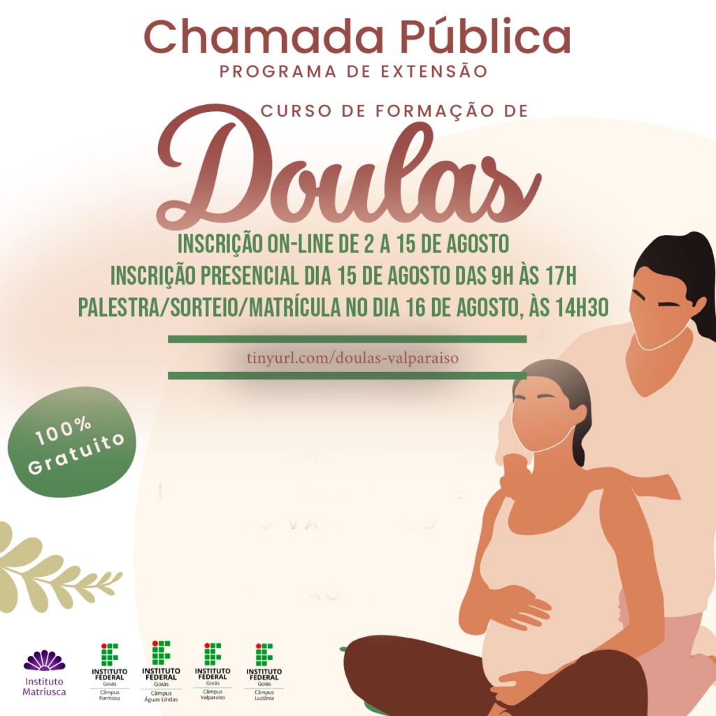 Já as mulheres que sonham em acompanhar mulheres durante o ciclo gravídico puerperal e desejam se inscrever no Curso de Formação de Doulas, as inscrições podem ser realizadas até o dia 15 de agosto, de forma online por meio do link forms.gle/XPNT7AqZ6TcdZcay8 ou presencial, no IFG Valparaíso, localizado na Avenida Saia Velha, Km 6, BR-040, s/n – Parque Esplanada IV, das 9h às 17h, mediante a apresentação da documentação original e cópia da Carteira de Identidade, CPF e comprovante de endereço.